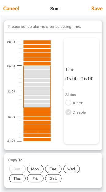 5. Select which times you want the PIR sensor to be enable or disabled. You can copy the schedule to other days of the week, then click Save.