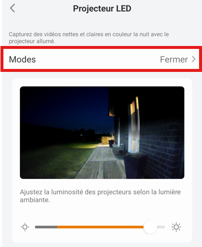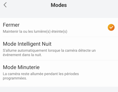 Dans les modes, vous pouvez choisir d'activer la lumière à des moments précis ou automatiquement lorsqu'il y a un mouvement.